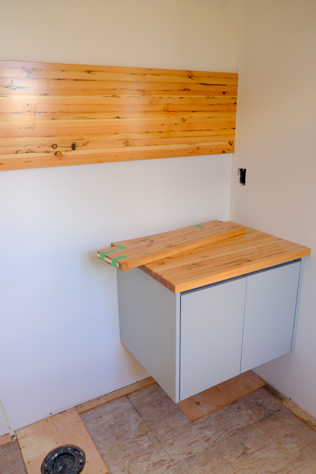 Main floor bathroom. All the wood counters and accents are made with reclaimed fir I found rotting in a field.