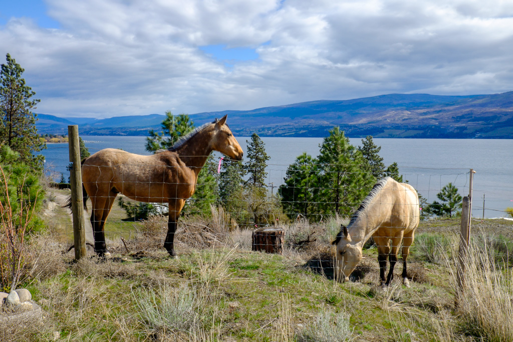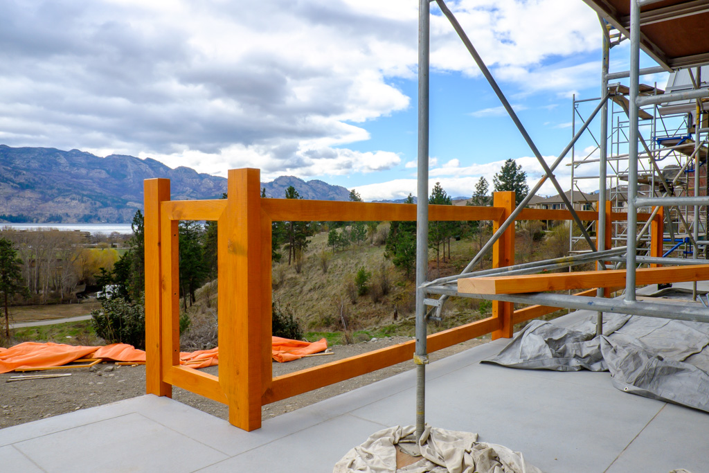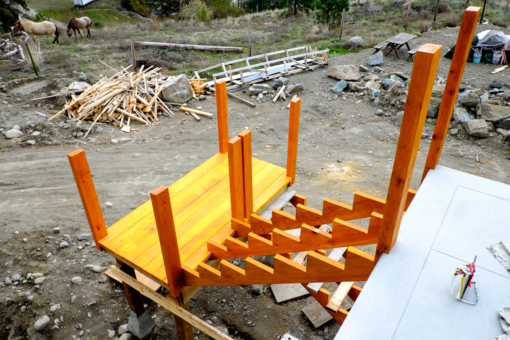 Deck posts & railings with our new neigh-bours (get it) in the background.