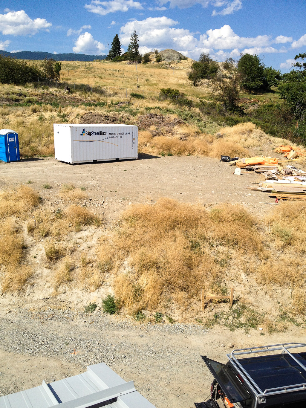 Our back view isn’t too shabby either, if you block out the portapotty and our bin full of most of our worldly possessions.