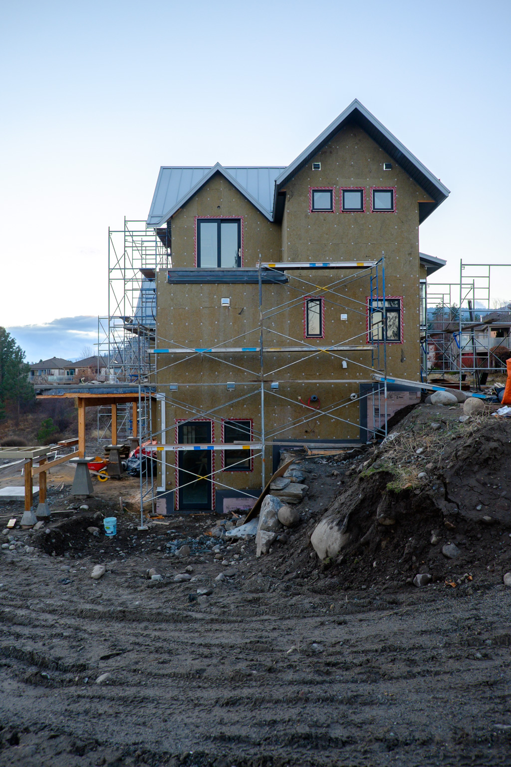 We got scaffolding up! Or, the stucco guys got scaffolding up.
