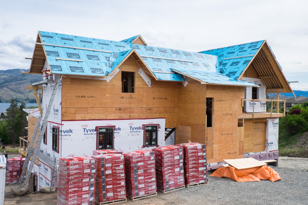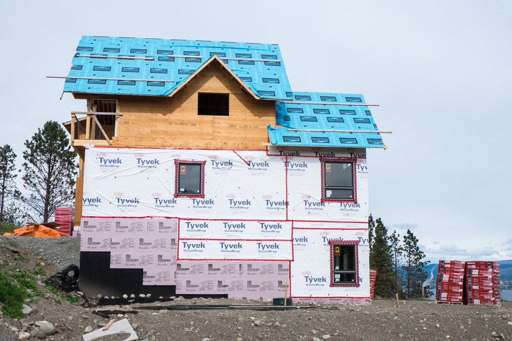 So, our next project has arrived. Pallets and pallets of Roxul insulation. This stuff is made from mine tailings in the Kootenays. It’s a stone based insulation that breathes. We’ll be poking a bunch of holes in the house wrap to install this, then more holes for mounting the siding, stucco and galvalume.
